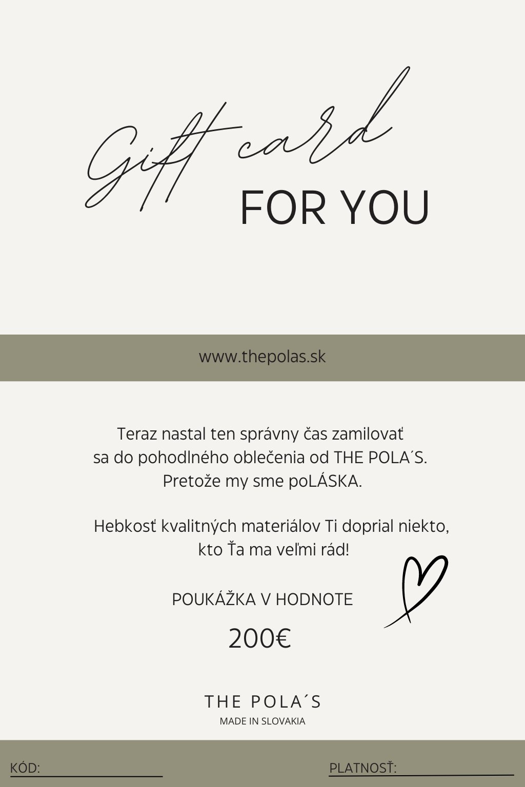 Darujte pohodlnosť produktov od THE POLA´S. Darčekový poukaz je možné využiť na nákup našich produktov cez náš e-shop, jeho platnosť je 12 kalendárnych mesiacov od dňa jeho zakúpenia.